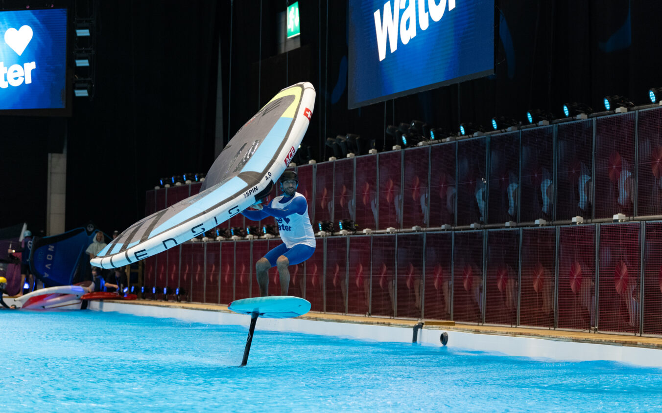 Michi “Rawham” wingfoiling in the pool. All those days training in lightwind on Swiss lakes helped a lot in the pool!