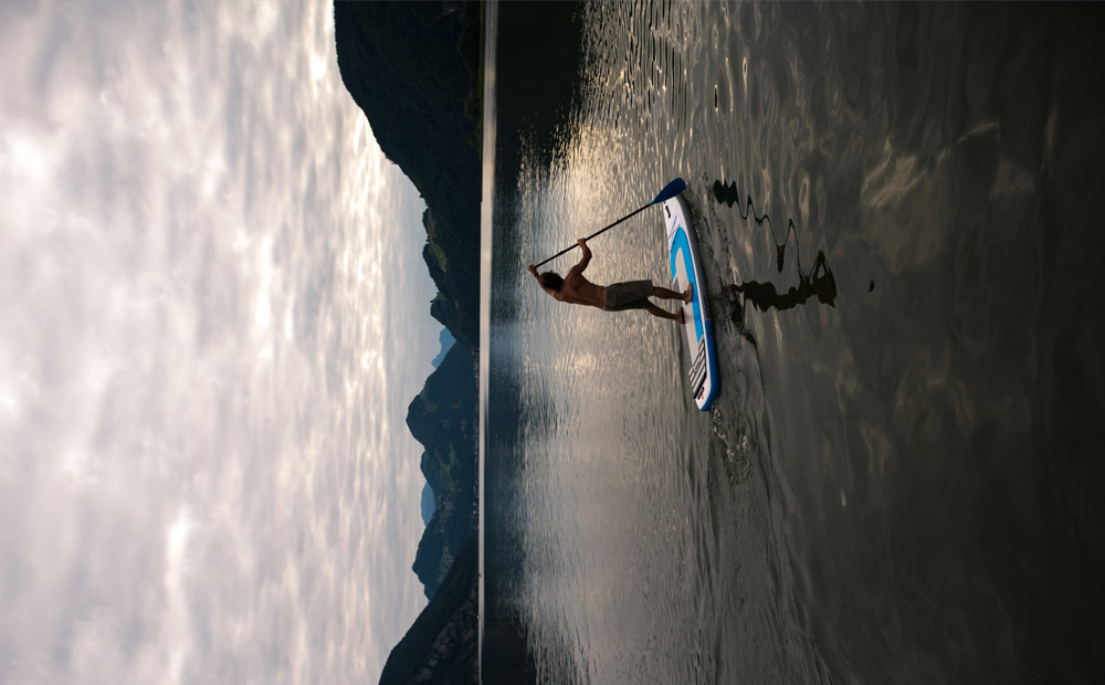 Inflatable SUP, high quality roller bag, highly efficient single action pump, 1 center fin and 2 side fins, 3-piece ultralight fiberglass paddle, coil leash Also available without paddle and coil leash.